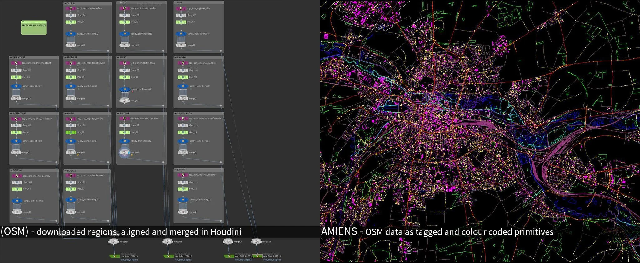 Purple nodes are each loading in an osm data file for each area of the map. The transforms nudge them into alignment with the neigbouring regions. The blue nodes are each a sub-network that reads attribute data on the geometry, and sorts them into groups, and then colour codes each group. Finally each regions outputs are merged back together, and all regions are saved off to disk via the green nodes at the bottom.
