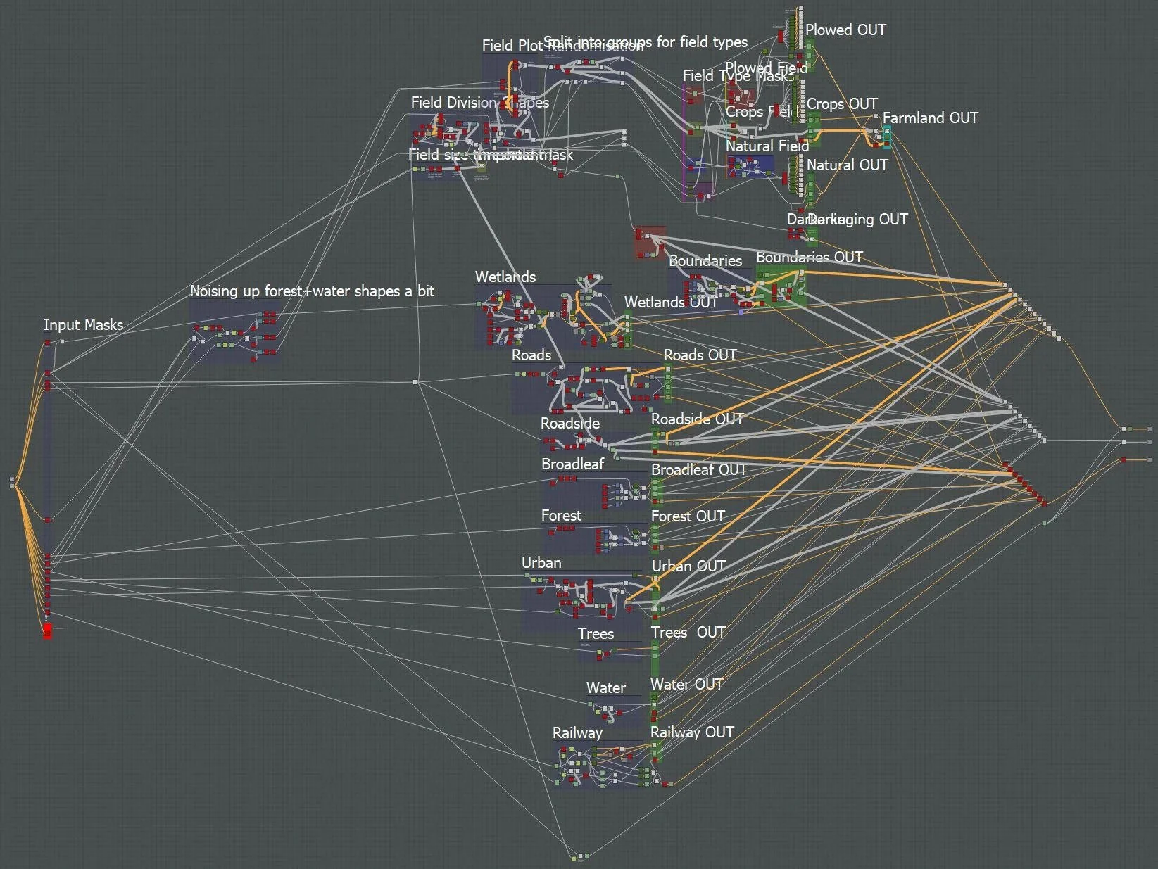 There is some method to this madness, the two input mask images are loaded in on the left, then they are split into their colour coded components. Most of the complex stuff happens up the top of the graph where the farmland patterns are generated. Each blue box contains the main cluster of nodes to generate the texture for each element, and then the output results for each element are gathered in the green boxes. The 3 diagonal clusters of nodes on the right are where all the elements are merged together for the final output as colour, roughness and normal maps.