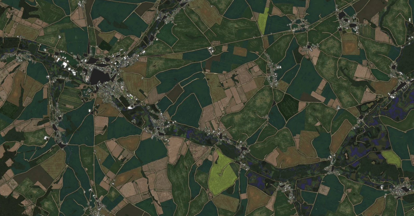 The usual suspects - as you can see not all the main features come from the OSM data directly. The substance did a bunch of subdivision of fields into smaller fields, and then assigned different criteria to each sub field which defined whether it was planted with crops, or maybe it was plowed dirt, or perhaps it was left natural and wasn't farmland at all.